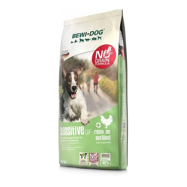 BEWI DOG® sensitive GF ist unsere neue Futtervariante für Hunde mit einer Unverträglichkeit gegen Getreide – durch die ausschließliche Verwendung von Geflügel als tierische Eiweißquelle und dem bewussten Verzicht auf Getreide in der Rezeptur wird das Futter auch von ernährungssensiblen Hunden und Allergikern bestens vertragen. Alle unsere Produkte werden hergestellt ohne die Verwendung von Soja sowie künstlicher Farb-, Geschmacks und Konservierungsstoffe!