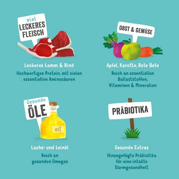 Lamm 30%, Rind 30%, Karotte 2%, Mineralstoffe, Mannan-Oligosaccharide (MOS), Brokkoli (getrocknet) 0,25%, Rote Bete (séchée) 0,25%, Leinsamenöl, Fructo-Oligosaccharide (FOS), Lachsöl, Apfel (getrocknet) 0,06%, Birnen (getrocknet) 0,05%, Banane (getrocknet) 0,05%, Blaubeeren (getrocknet) 0,05%, getrockneter Fenchel 0,01%, getrockneter Kümmel 0,01%, getrocknete Schafgarbe 0,01%, getrocknete Brombeerblätter 0,01%, getrocknete Mistel 0,01%, getrocknete Kamillenblüten 0,01%, getrocknete Enzianwurzel 0,01%, getrocknetes Tausendgüldenkraut 0,01%
