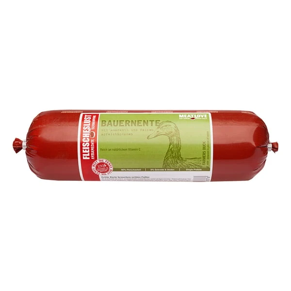 Die Futterwurst Bauernente von Fleischeslust ist ein komplettes Nassfuttermenü mit Bauernente, Amaranth und Apfelstücken in Wurstform. Die leckere Mahlzeit besteht zu 80 Prozent aus frischem Fleisch und wird ohne künstliche Aroma-, Farb- und Konservierungsstoffe sowie chemische Bindemittel hergestellt. Das Menü enthält ausschließlich ein Protein und alle wichtigen Nährstoffe und Vitamine.
