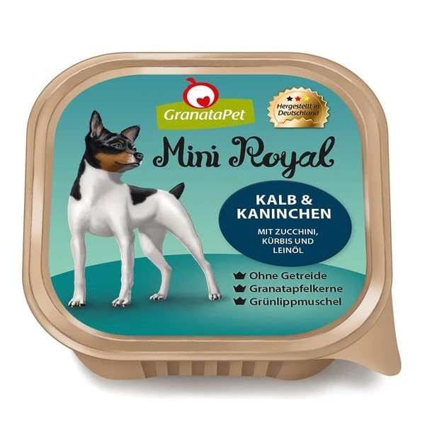 Wenn du ein getreidefreies Nassfutter für deinen Hund suchst, hast du es jetzt gefunden. Nur das beste Futter füllst du mit GranataPet Mini Royal Kalb und Kaninchen in den Napf. Das Futter ist für kleine Hunderassen zu empfehlen sowie speziell auf die Bedürfnisse von erwachsenen Hunden und Senioren angepasst. Um den Eiweiß- und Energiebedarf deines Hundes abzudecken, eignet sich vor allem dieses proteinreiche Hundefutter. Hochwertiges Protein liefert das enthaltene Herz. Da das Nassfutter frei von Gluten und Getreide ist, ist es prädestiniert für ernährungssensible Hunde, die zu Allergien oder Unverträglichkeiten neigen. Verzichtet wird außerdem auf die Zugabe von Zucker, Soja, Farbstoffen und Konservierungsmitteln.