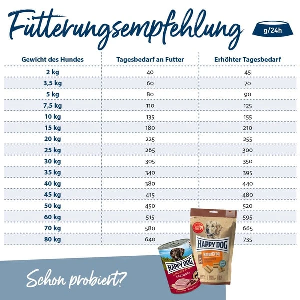 Bei zusätzlicher Gabe von Snacks oder anderen Zusatzprodukten ist die Futtermenge zu reduzieren. Aufgrund individueller Stoffwechselunterschiede der Hunde kann die angegebene Menge des Normalbedarfs bei Veranlagung zu Übergewicht um bis zu 15 % gekürzt werden