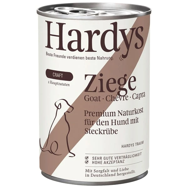 Der Grundgedanke unseres getreidefreien Nassfutters Hardys Craft Ziege & Steckrübe ist konsequent: Eine Proteinquelle. Eine Gemüsesorte. Das war’s. Damit bieten wir mit Hardys Craft Ziege & Steckrübe alles, was Ihr Hund braucht. Unser Menü haben wir als Nassfutter in Zusammenarbeit mit erfahrenen Tierheilpraktikern entwickelt. Und die nehmen es ganz genau. Denn so besteht Hardys Craft Ziege & Steckrübe zu 67 Prozent aus sortenreinem, hochwertigen Fleisch und zu sechs Prozent aus einer bewusst ausgewählten Gemüsesorte. Hardys Craft Ziege & Steckrübe ist frei von Laktose, ohne Getreide und wird angereichert mit notwendigen Mineralien und hochwertigem Nachtkerzenöl. Zudem sind alle Bestandteile unseres Hundefutter ganz natürlich gezüchtet und gepflanzt sowie frei von Gentechnik.