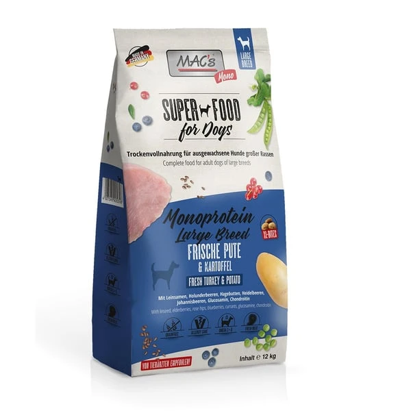 MAC’s Dog Monoprotein Large Breed Frische Pute und Kartoffel ist ein hochwertiges Trockenfutter, das speziell zur Fütterung großer Hunderassen entwickelt wurde. Es eignet sich ideal zur täglichen Ernährung ausgewachsener Hunde. Die ausgewogene Rezeptur basiert auf gut verdaulicher Pute, die als einzige tierische Proteinquelle dient. Angereichert ist das Hundefutter unter anderem mit Kartoffeln, Erbsen sowie verschiedenen Beerensorten.