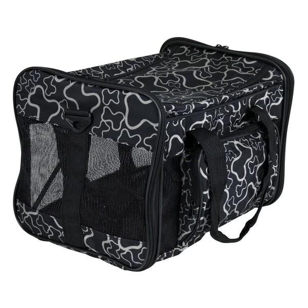 Die Transporttasche aus Polyester lässt sich gleichzeitig von drei Seiten öffnen: oben, vorne und hinten. An den Enden befinden sich jeweils Taschen, die zusätzlichen Stauraum schaffen. Für Tragekomfort sorgt der abnehmbare und stufenlos verstellbare Schulterriemen. Netzeinsätze an den Seiten sorgen für eine angenehme Luftzirkulation und die integrierte Kurzleine verhindert das Herausspringen. Die Bodenplatte ist mit Plüsch bezogen und herausnehmbar.
